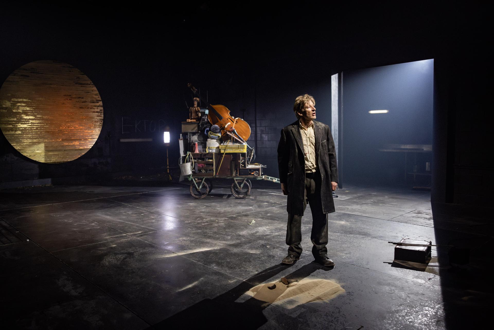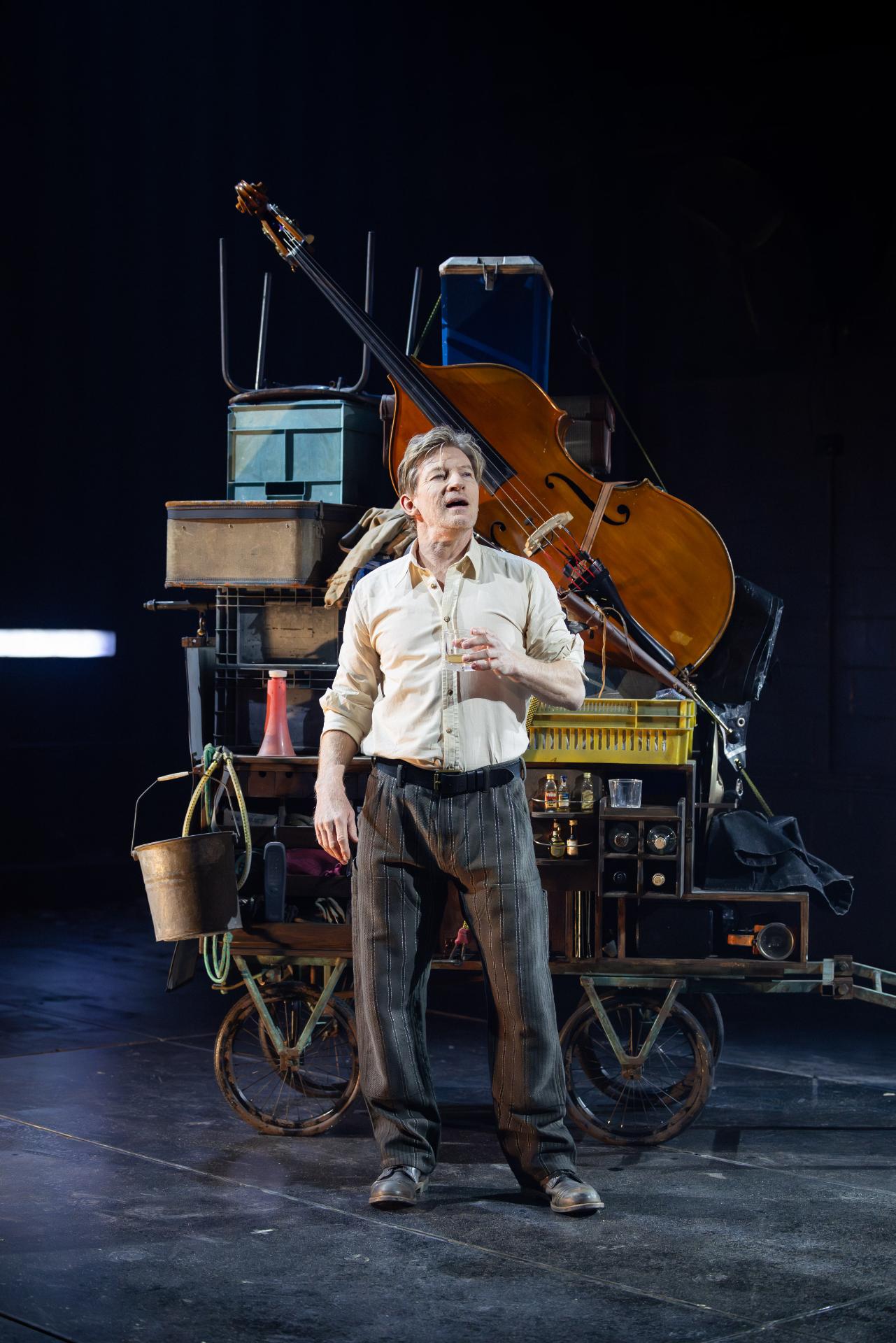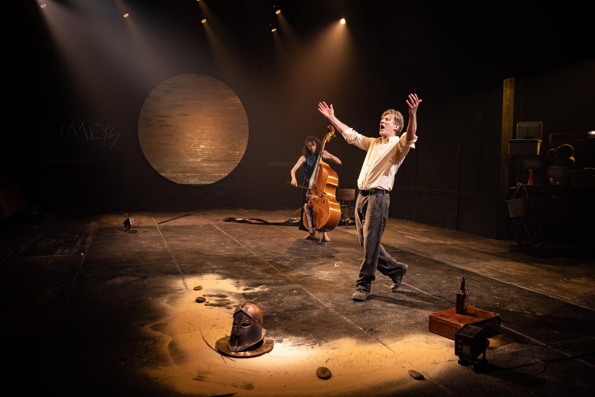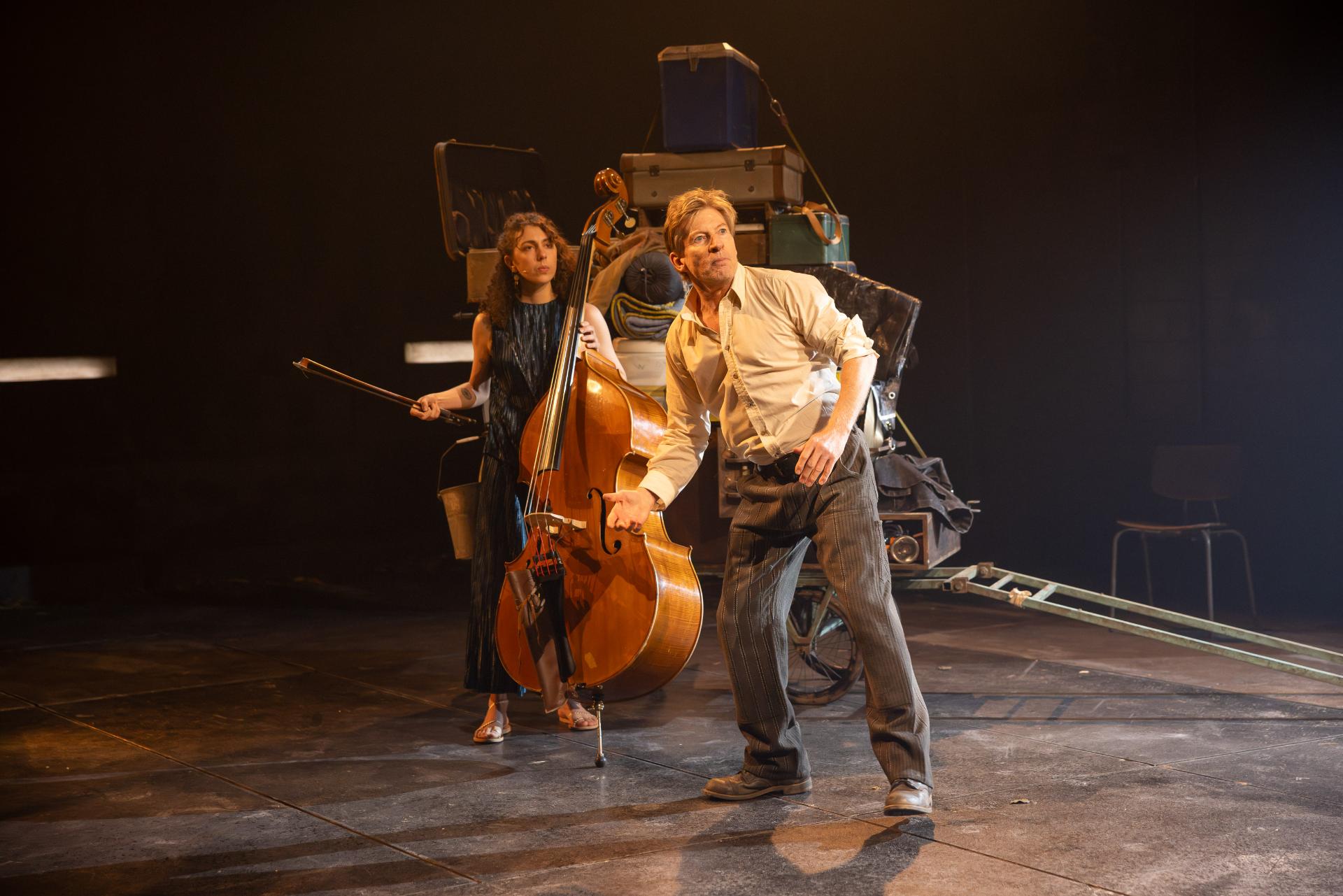 Appearing alongside him, musician Helen Svoboda performs much of the score live, to marvellous and haunting effect. In concert with Brady Watkins’ sound design, her compositions imbue the production with a visceral grandeur that makes tangible the true scale of the narrative. Alexander Berlage’s lighting matches this ambition with sweeping, monumental tableaux—shafts of amber and sudden abysses of shadow—yet never sacrifices intimacy for spectacle; his illumination is sombre, his darkness articulate, reinforcing the production’s cumulative gravity. Charles Davis’ production design is memorably austere, its disciplined sparseness thrown into relief by a single, totemic cart that The Poet drags through the narrative’s sombre hush, stacked to towering heights with the accumulated relics of a civilisation—each object a vessel of memory, each layer another stratum of war’s inexorable geology.