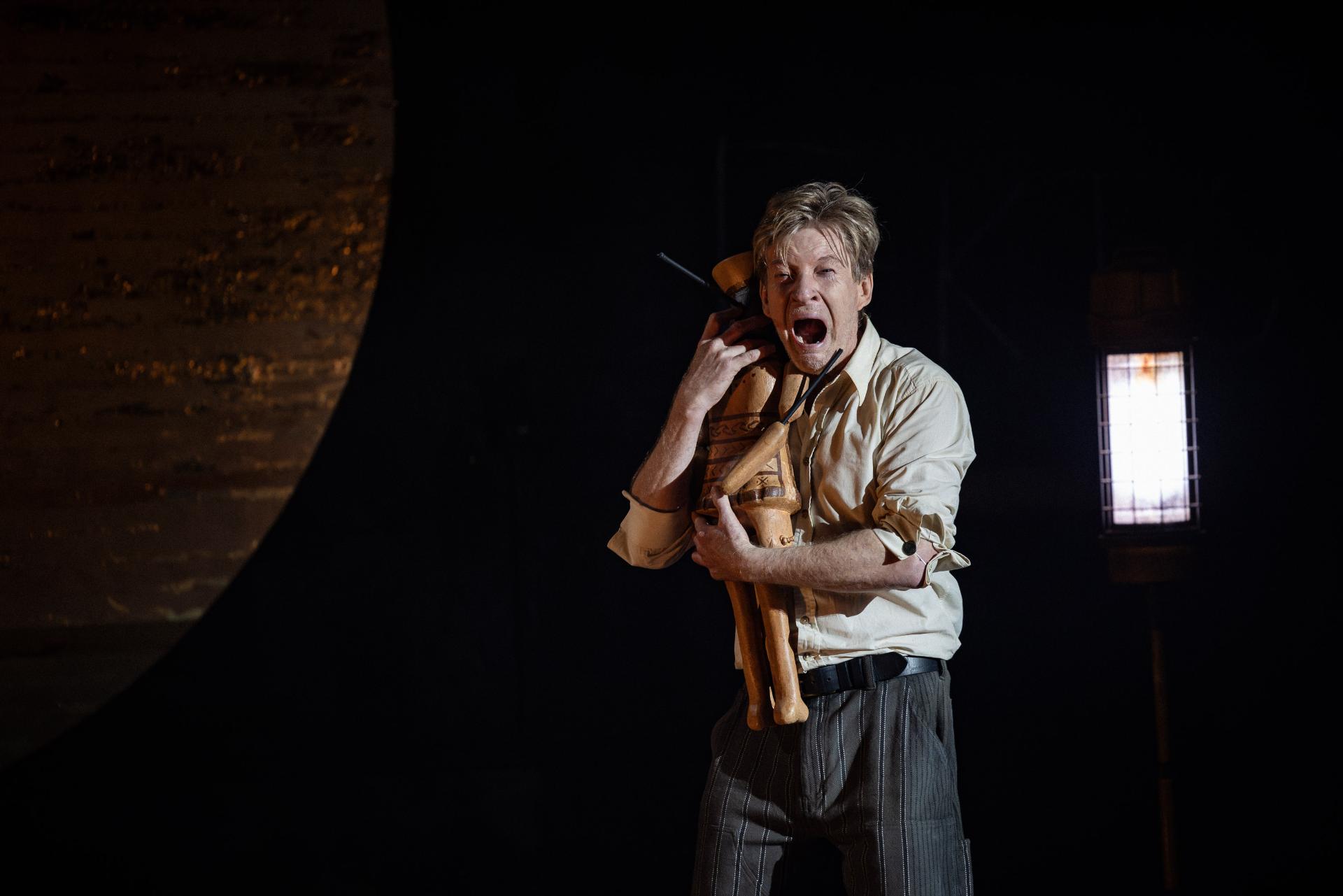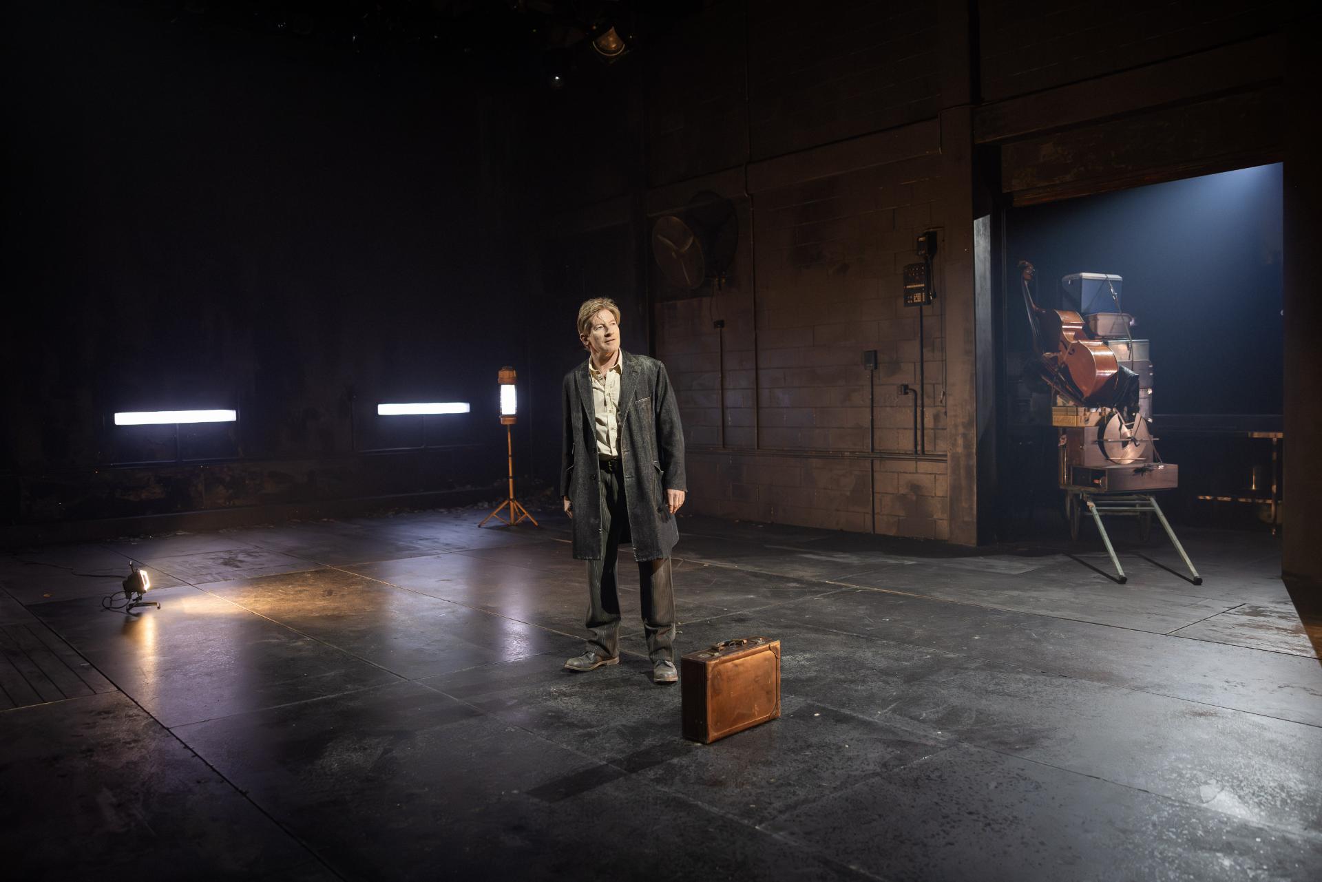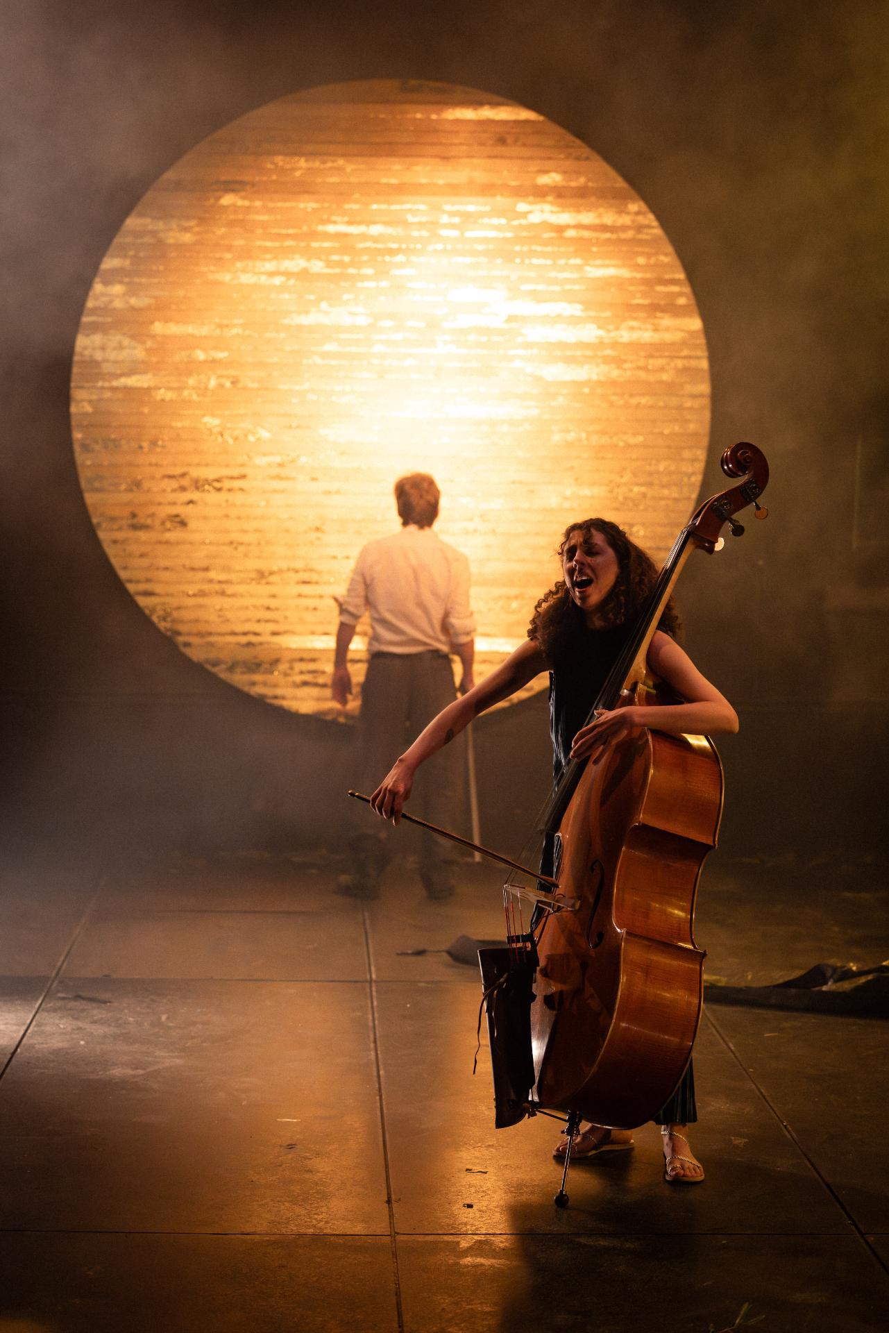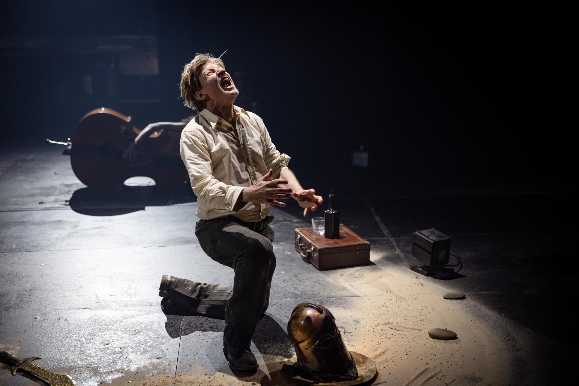 Appearing alongside him, musician Helen Svoboda performs much of the score live, to marvellous and haunting effect. In concert with Brady Watkins’ sound design, her compositions imbue the production with a visceral grandeur that makes tangible the true scale of the narrative. Alexander Berlage’s lighting matches this ambition with sweeping, monumental tableaux—shafts of amber and sudden abysses of shadow—yet never sacrifices intimacy for spectacle; his illumination is sombre, his darkness articulate, reinforcing the production’s cumulative gravity. Charles Davis’ production design is memorably austere, its disciplined sparseness thrown into relief by a single, totemic cart that The Poet drags through the narrative’s sombre hush, stacked to towering heights with the accumulated relics of a civilisation—each object a vessel of memory, each layer another stratum of war’s inexorable geology.