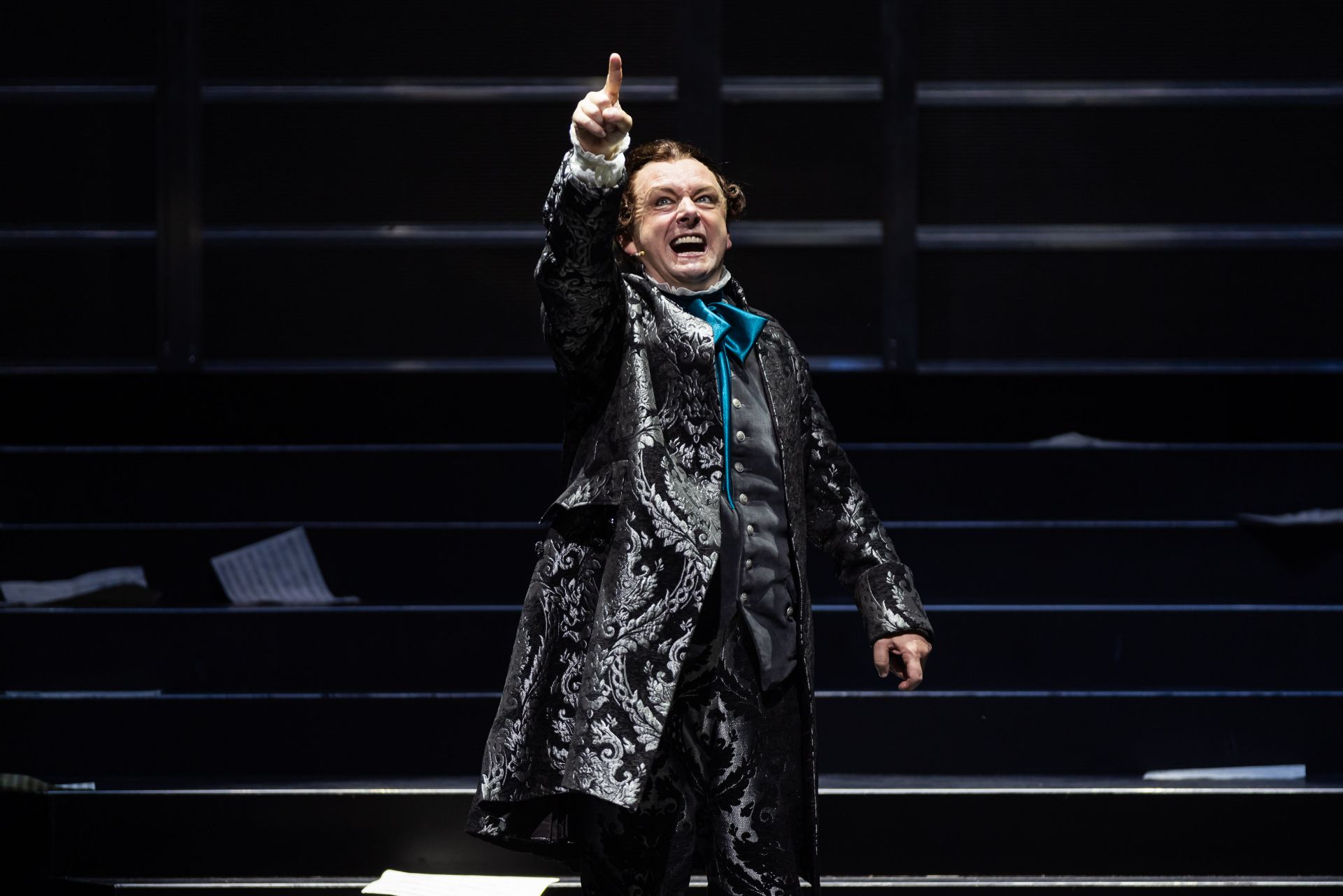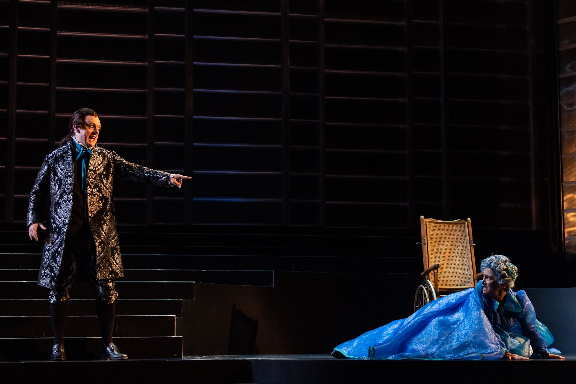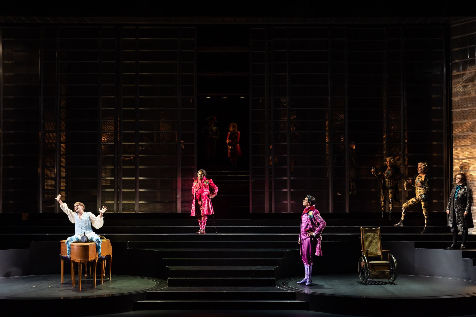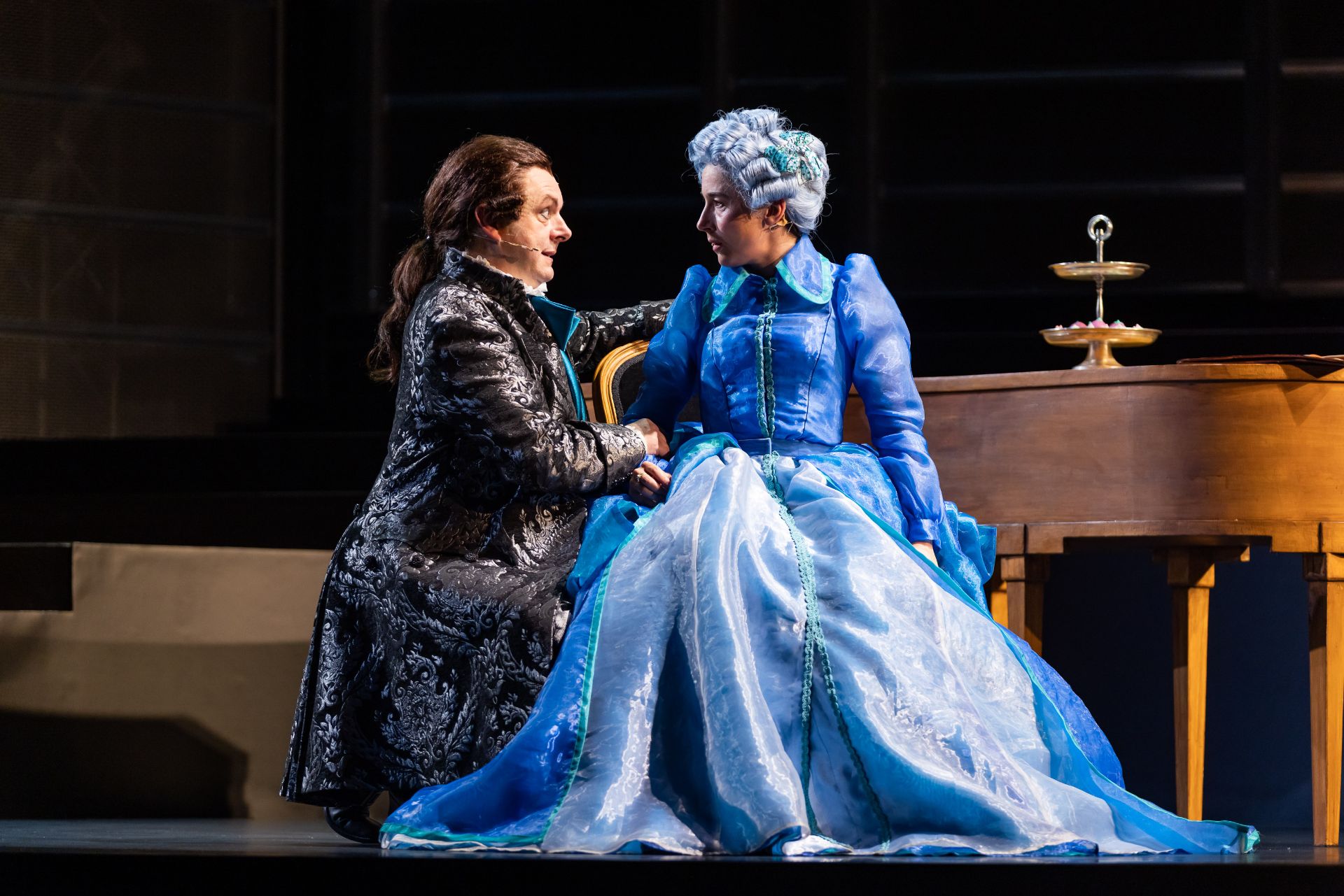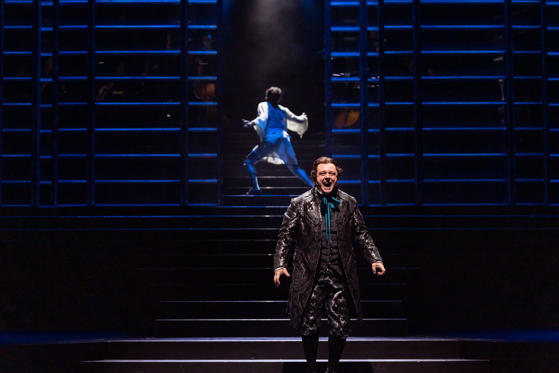 Almost half a century hence, Craig Ilott’s direction of the piece is memorable for its extravagant incorporation of live music (performed by The Metropolitan Orchestra), which delivers for the production an unmistakeable transcendence, such is the power of Mozart. Also highly impressive are costumes by Romance Was Born and Anna Cordingley, providing remarkable flourish and extraordinary exuberance, against a restrained black stage. Designed by Michael Scott-Mitchell, the set feels appropriately grand, with clever placement of stairs that facilitate many visually satisfying configurations of performers and their kaleidoscopic attire. Lights by Nick Schlieper offer a touch of sophistication, helping us pay attention to the real drama unfolding, in the middle of a lot of hullabaloo.