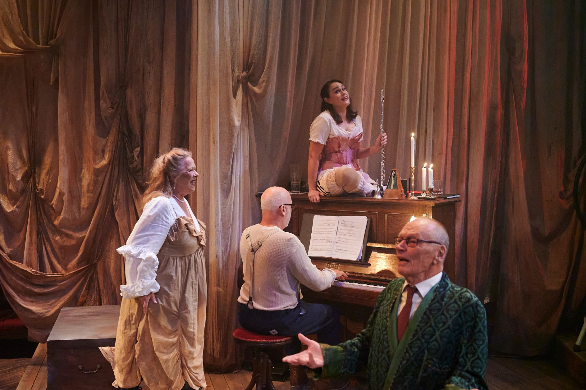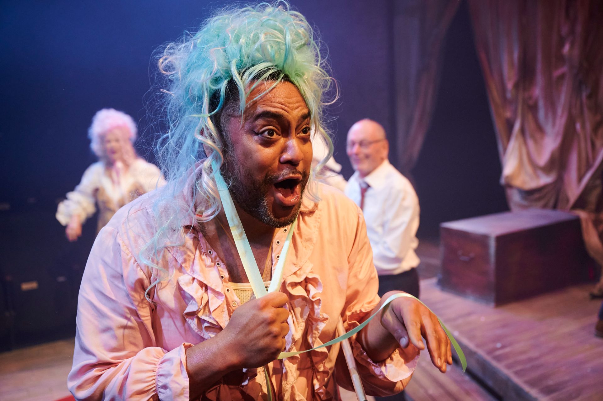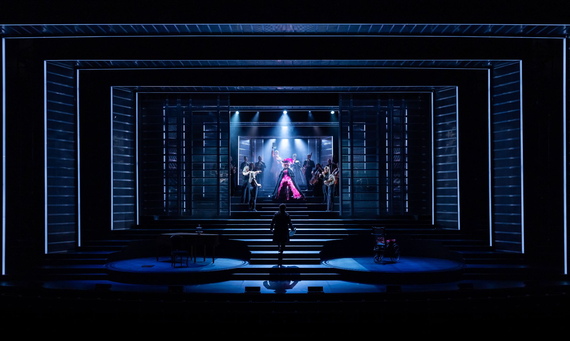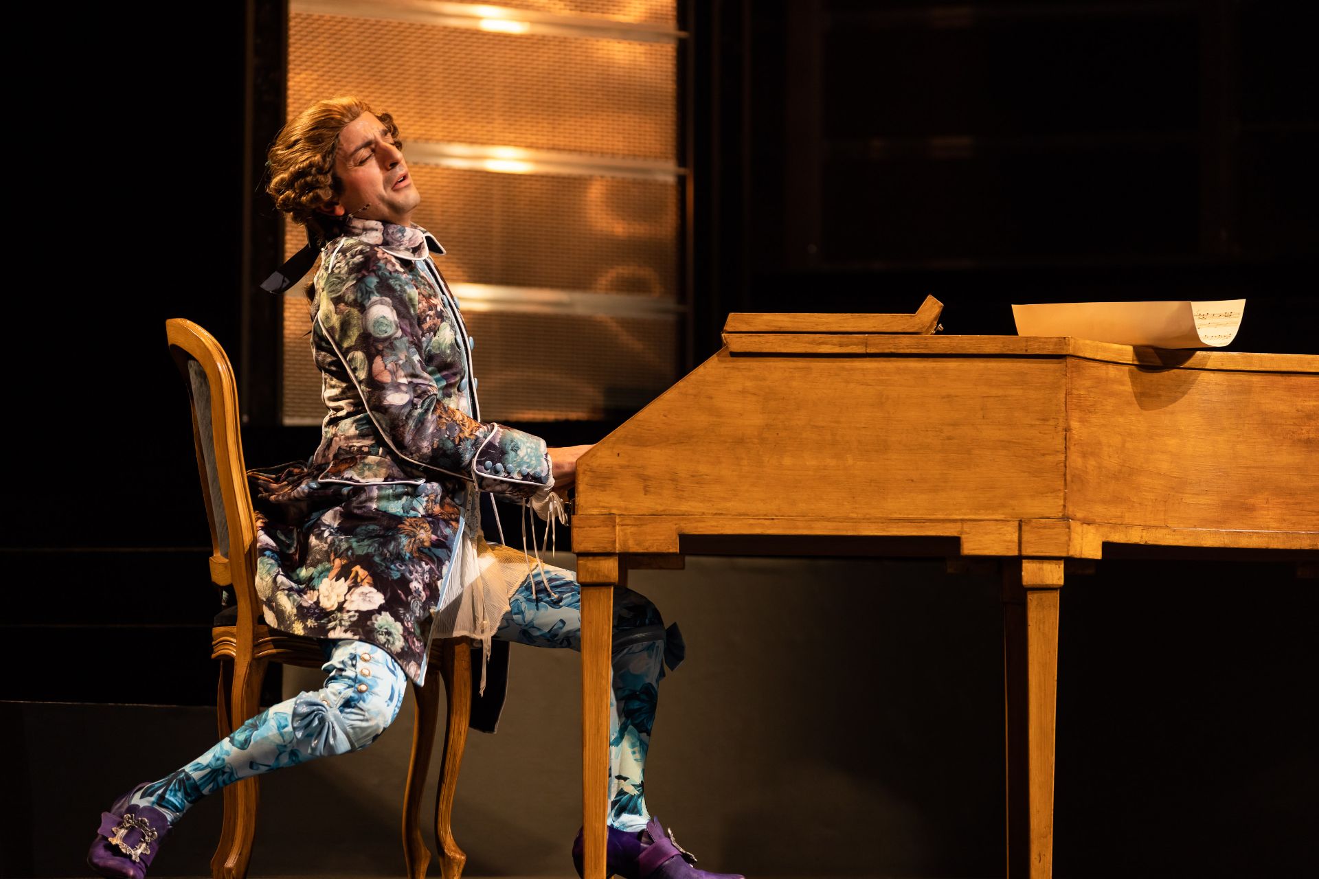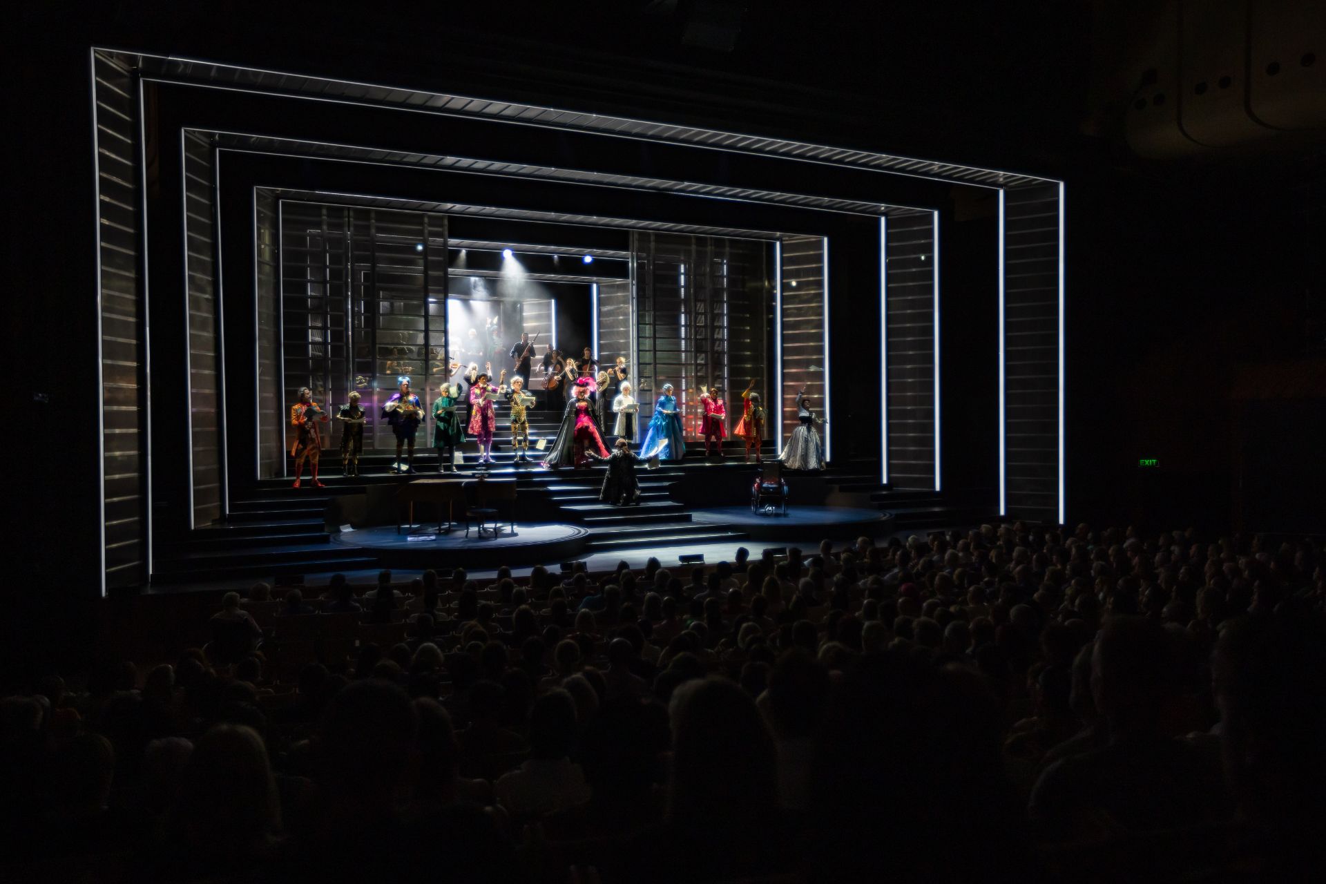 Almost half a century hence, Craig Ilott’s direction of the piece is memorable for its extravagant incorporation of live music (performed by The Metropolitan Orchestra), which delivers for the production an unmistakeable transcendence, such is the power of Mozart. Also highly impressive are costumes by Romance Was Born and Anna Cordingley, providing remarkable flourish and extraordinary exuberance, against a restrained black stage. Designed by Michael Scott-Mitchell, the set feels appropriately grand, with clever placement of stairs that facilitate many visually satisfying configurations of performers and their kaleidoscopic attire. Lights by Nick Schlieper offer a touch of sophistication, helping us pay attention to the real drama unfolding, in the middle of a lot of hullabaloo.