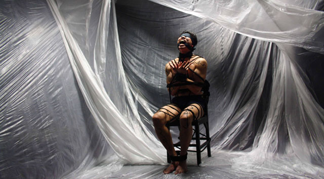 The Library Of Babel takes the form of one big theatrical space, with seven small rooms located within. 16 artists present incongruous and deliberately perplexing pieces of performance art, as we wander through the maze, looking at, and sometimes interacting with, these otherworldly creatures.